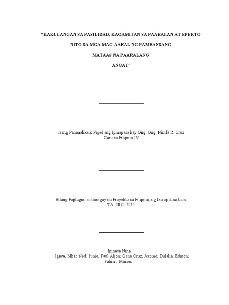 Pinamagatang Kakulangan sa Pasilidad Kagamitan sa Paaralan at Epekto nito sa mga Mag-aaral ng Pambansang Mataas na Paaralang Angat ay naglalayong ipakita ang mga posibleng epekto ng mga kakulangan pasilidad at kagamitan lalo na sa aspeto ng edukasyon. Maaring hindi rin nila alam ang tamang pagbaybay at paggmit ng bantas dahil walang gurong tumatalakay nito sa. Ito ay may kakayahan na palakihin ang mga imahe upang mas maayos na maipakita ang mga halimbawa ng mga tagapagturo.