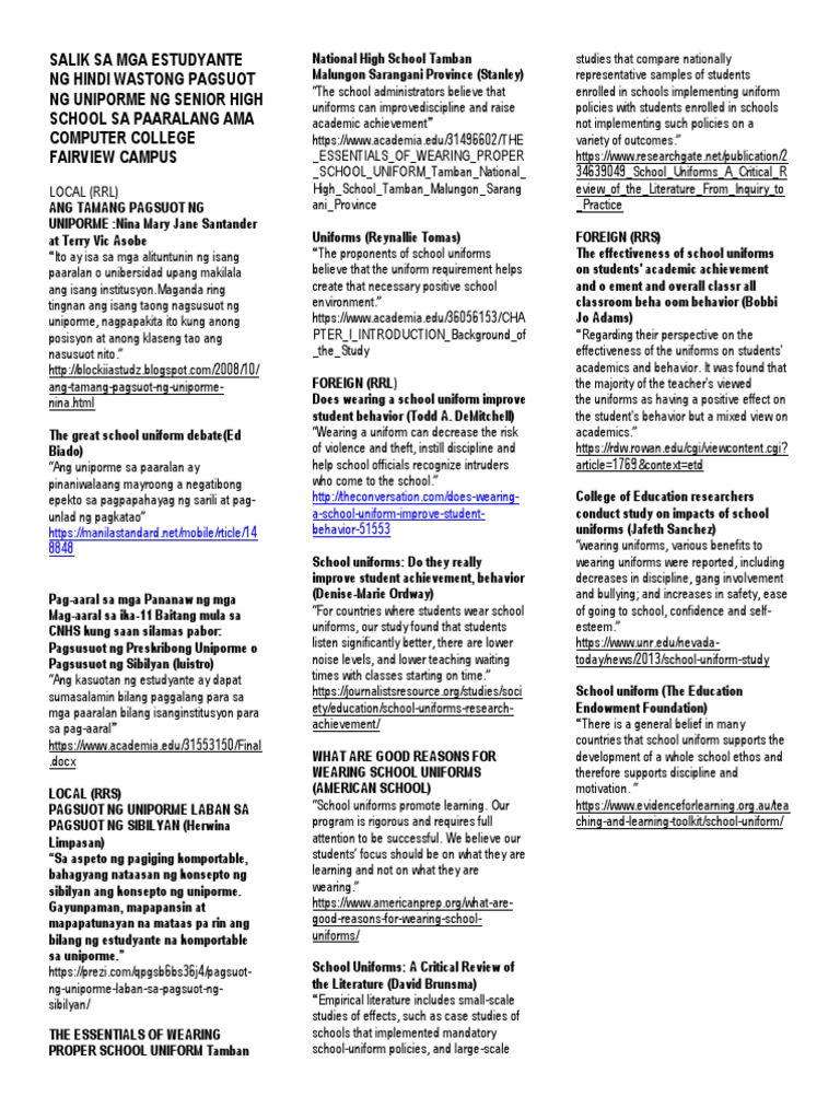 Ang pagsuot ng uniporme ay isa sa mga palatandaan na ikaw talaga ay isang estudyante o mag-aaral kaya ang lahat ng mga estudyante ay dapat na magsuot ng tama at maayos na uniporme at hindi yong papasok sa. May nakukulong ba pag hindi nag-declare ng tamang OR sa BIR. Ang unang hack sa kalinisan ay ang pagsuot ng tamang uniporme sa loob ng pasilidad.